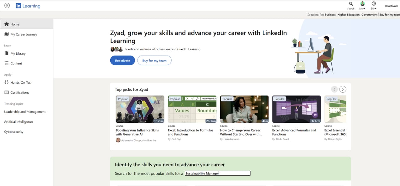LinkedIn Learning is the most practical path in this list — short lessons, real workplace scenarios, and topics that directly support your productivity, reporting, communication, data skills and everyday AI use.