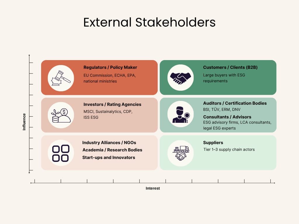 External refers to the broader ecosystem: consultants, auditors, SaaS tools, NGOs, regulators, and others influencing how companies act.