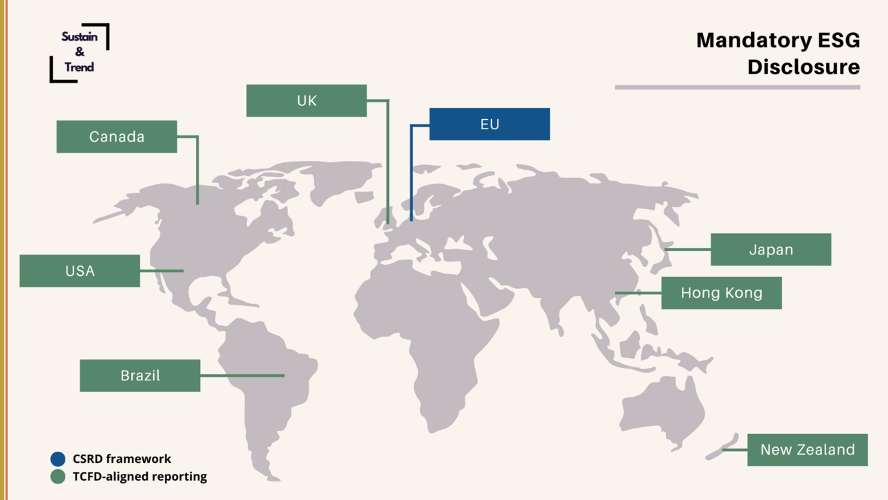 As concerns over climate change and environmental sustainability grow, more countries are requiring companies to disclose their sustainability performance, particularly related to climate-related financial risks. A key framework for this is the Task Force on Climate-related Financial Disclosures (TCFD), which has been integrated into many national regulations. However, regions like the European Union (EU) have introduced the Corporate Sustainability Reporting Directive (CSRD) with European Sustainability Reporting Standards (ESRS), which go beyond climate-related disclosures to cover broader ESG topics.